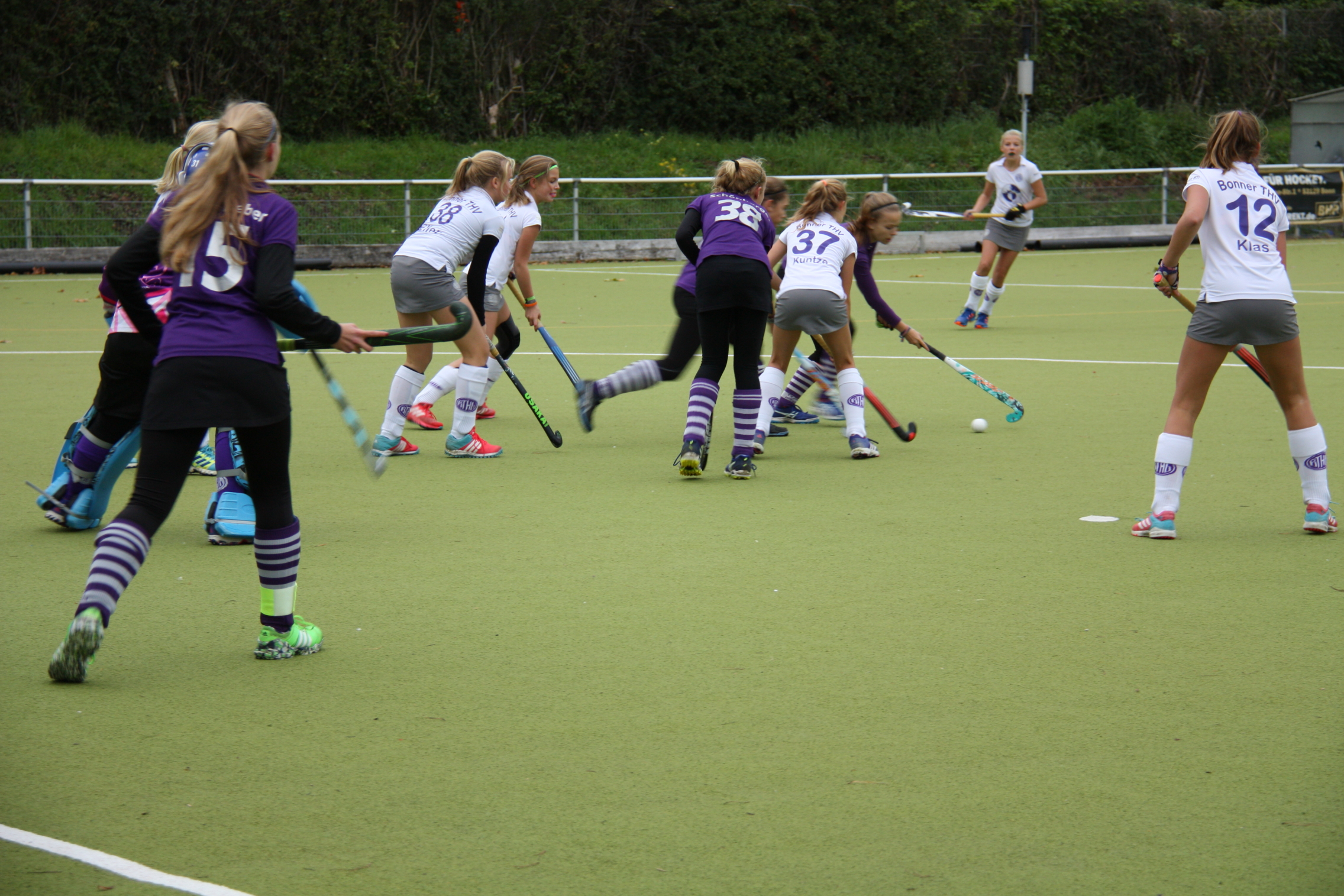 Bereits zur Halbzeitpause hat es vier Mal in unserem Kasten gerappelt. Kleine Unaufmerksamkeiten in der Abwehr wurden von Bonn konsequent genutzt und nach vorn wollte kein richtiger Zug zum gegnerischen Schusskreis aufkommen. Nach kurzem Abtasten machte Bonn ernst und in der 24. Minute stand es bereits 0:3. Kathi musste anschließend früher als geplant Hanna ablösen, die feststellen musste, dass ihr Rücken zum Stoppen von harten Abprallern nicht geeignet ist. AUA! Kurz vor dem Halbzeitpfiff gab es dann das 0:4 nach kurzer Ecke, bevor Hiesfeld erstmals gefährlich, aber ohne zählbares Ergebnis im Bonner Schusskreis auftauchte.