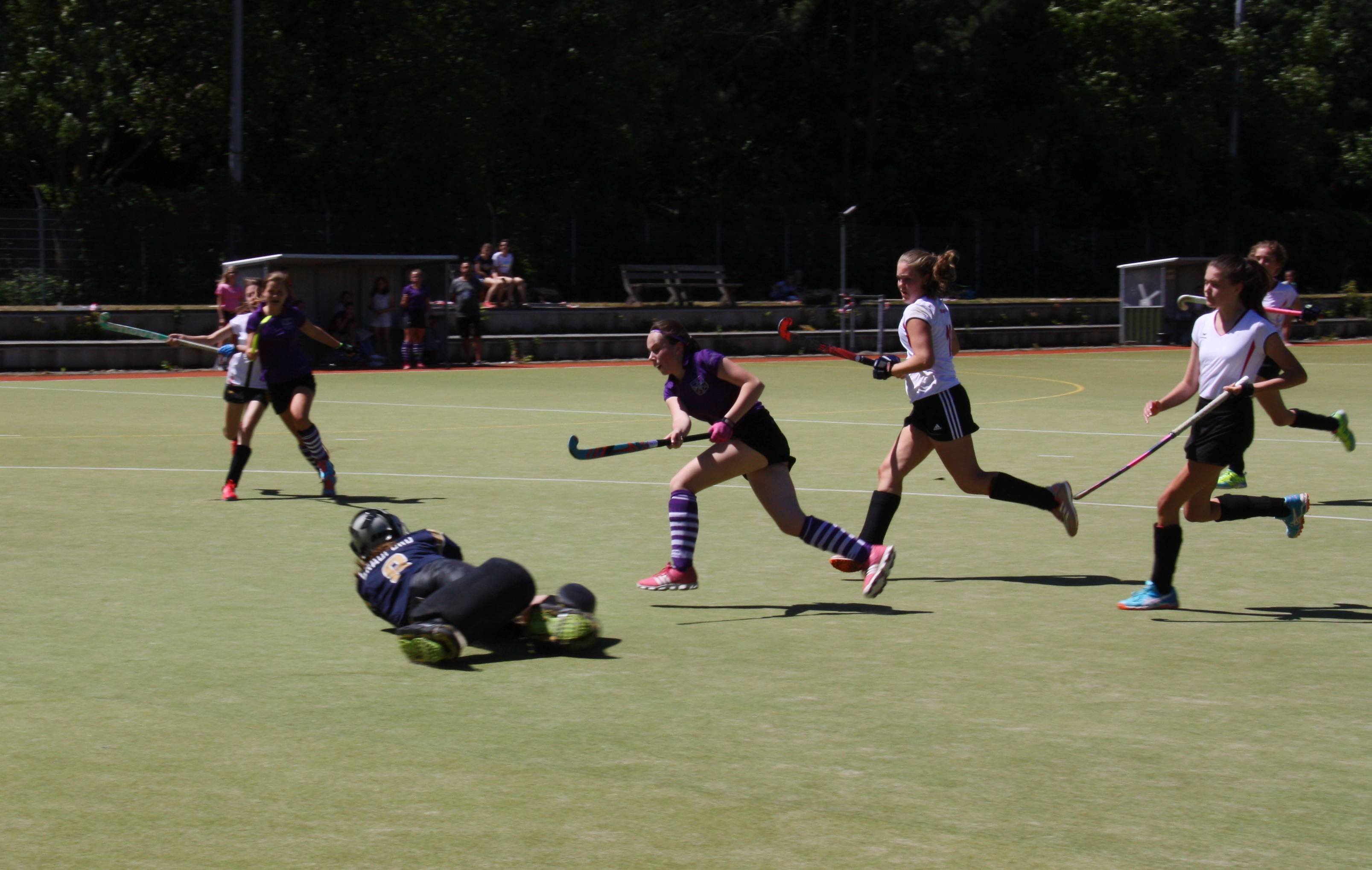 Zur zweiten Halbzeit kam nach einigen taktischen Umstellungen ein neues Hiesfelder Team auf den Platz. Gegenspielerinnen wurden aggressiv angegangen, der Ball auch im Mittelfeld nicht preisgegeben, die Offensivkräfte haben toll mit nach hinten gearbeitet. Mit der neuen Ausrichtung ging auch der Spielaufbau plötzlich viel einfacher und schneller von statten, alle haben sich bewegt und den Ball gefordert, nach vorne ergaben sich immer wieder gute Anspielmöglichkeiten. Gemäß dem Motto: Angriff ist die beste Verteidigung. Mitte der zweiten Halbzeit hatten Lielle Dohmen und Finja Roll große Chancen zum Führungstreffer, konnten die Kugel aber nicht im Wuppertaler Tor unterbringen. Nach grüner Karte für Lucy Kibben spielten die Hiesfelder für zwei Minuten in Unterzahl, was aber von der ETG, die zunehmend dem hohen Tempo Tribut sollen musste, nicht ausgenutzt werden konnte. Kurz darauf war es wieder Lielle Dohmen, die nach tollem Pass von Sophia Krisch in die Spitze die Führung auf dem Schläger hatte.