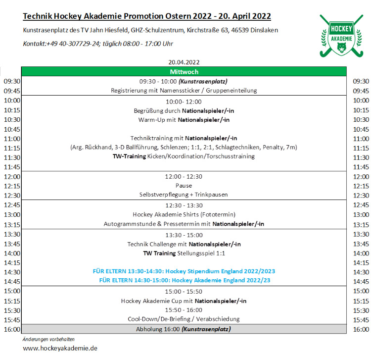 • Hockeymitglieder im Alter von 10-15 Jahren können kostenfrei am 20.4.2022 von 10-16 Uhr an der Technik Hockey Akademie mit einem aktuellen Nationalspieler (m/w) sowie erfahrenen Hockey Akademie Trainer teilnehmen.