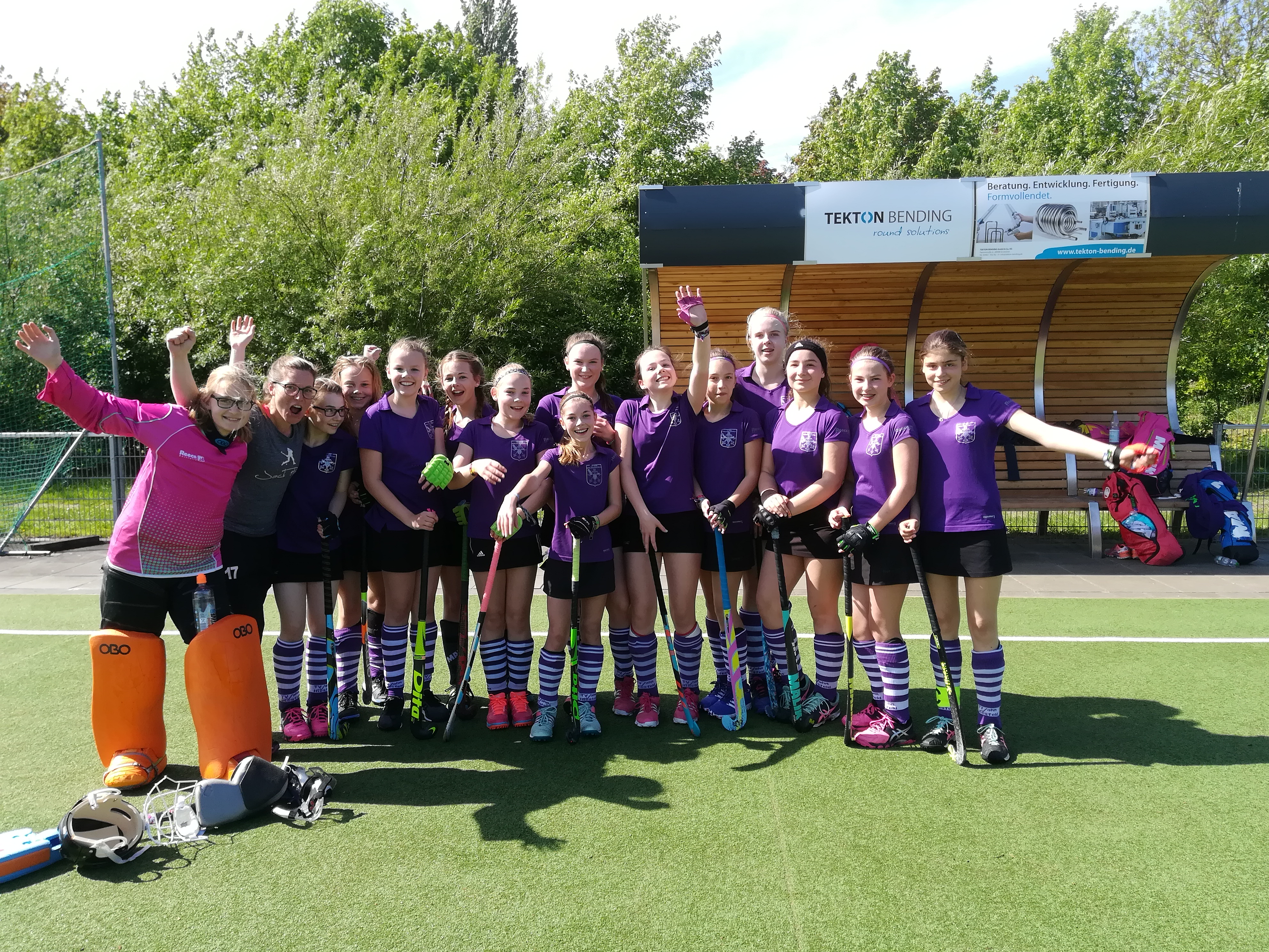 Nach der Pause erhöhten die Hiesfelder Mädchen den Druck auf das gegnerische Tor. Das Angriffsspiel wurde aus der eigenen Hälfte konzentriert aufgebaut und für alle mitgereisten Fans entwickelte sich ein mitreißender Hockeymorgen. Fast ein Dutzend kurzer Ecken gegen Rheine ergaben spannende Torszenen und in der Folgezeit fielen durch Finja, Lea, Mariella, Katharina und Amelie D. die Tore zum Endstand von 11:0!! Nach Abpfiff war der Jubel groß.