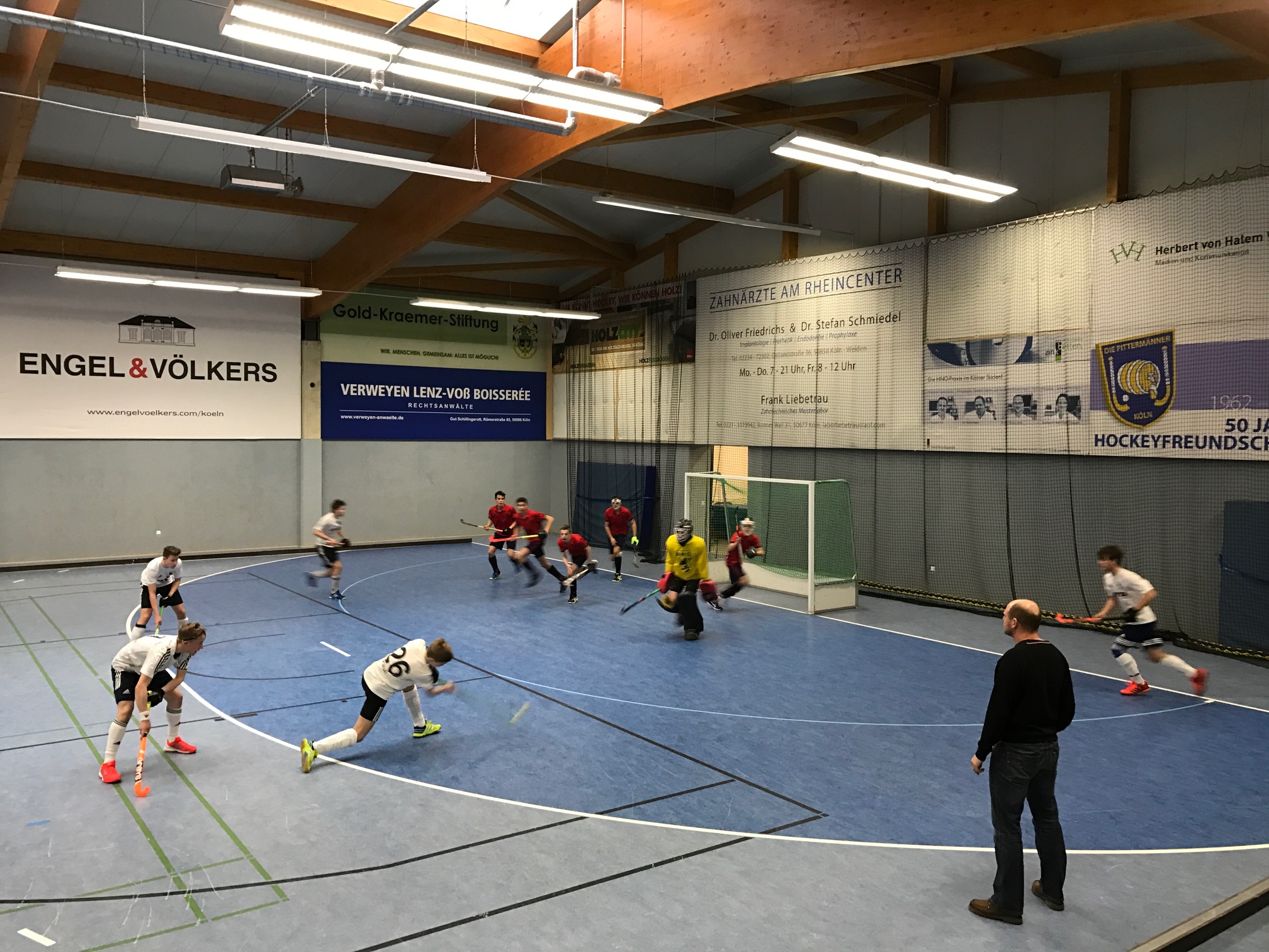 Die Spielgemeinschaft Hiesfeld/Oberhausen hat am vergangenen Sonntag in Köln, beim Sport-Club Marienburg, den Einzug in die Endrunde verpasst. Beim Auftaktspiel gegen den Düsseldofer HC dominierte die Spielgemeinschaft die ersten fünf Minuten deutlich. Dabei konnten zwei kurze Ecken nicht verwandelt werden. Stattdessen punkteten die Düsseldorfer bei Ihrem ersten Konter. Nachdem Eike Paul wg. einer Tätlichkeit die grüne Karte sah, schaffte der DHC gegen Hiesfeld/Oberhausen in Unterzahl das 2:0. Hiesfeld konnte den Druck aufrechterhalten. Wieder wurden zwei Strafecken nicht verwandelt und Chancen zum Ausgleich nicht genutzt. In der zweiten Halbzeit drehte sich das Blatt. Bereits nach einer Minute erhöhte der DHC auf 3:1. Dann war Hiesfeld/Oberhausen machtlos und leider ohne Torerfolg. Zwei Eckentore, ein Tor durch einen Siebenmeter und noch weitere Treffer führten zum Endstand 9:1. Da konnte auch der Ehrentreffer von Max May wenig trösten.
